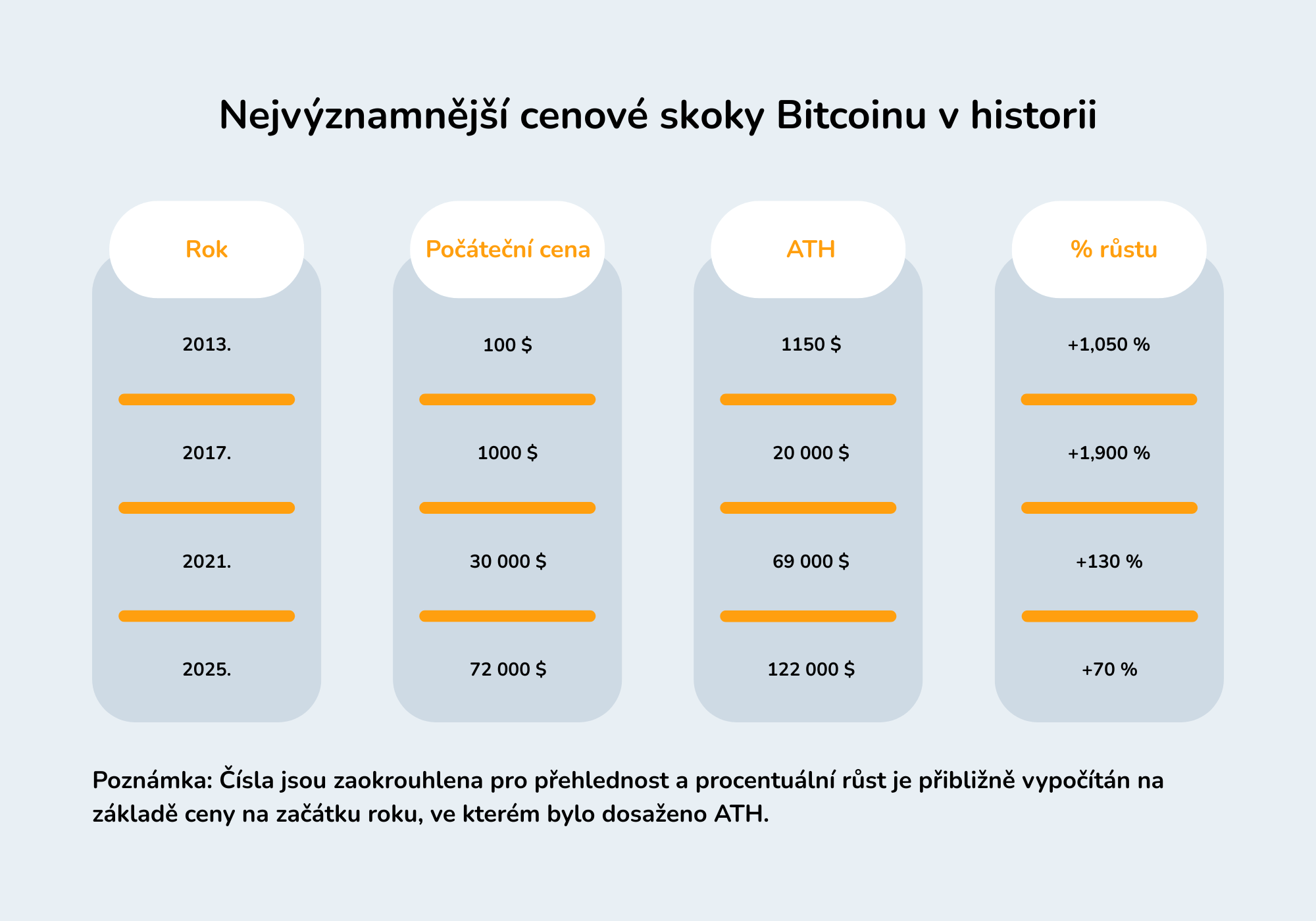 Během své historie prošel Bitcoin několika výraznými fázemi růstu a následné korekce. Některé skoky však vynikají svou velikostí a dopadem na trh.