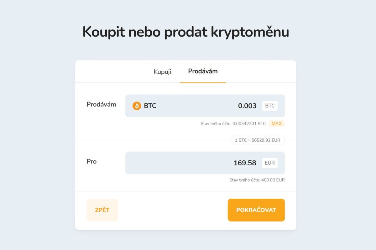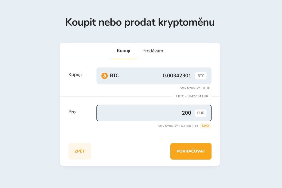 Zadání částky v EUR automaticky zobrazí množství kryptoměny, které byste měli obdržet při aktuálním směnném kurzu.