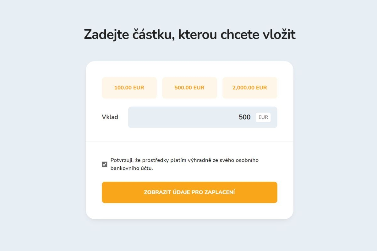 Zaškrtněte políčko potvrzující, že vkládáte prostředky výhradně ze svého osobního bankovního účtu, a klikněte na „Pokračovat“.
