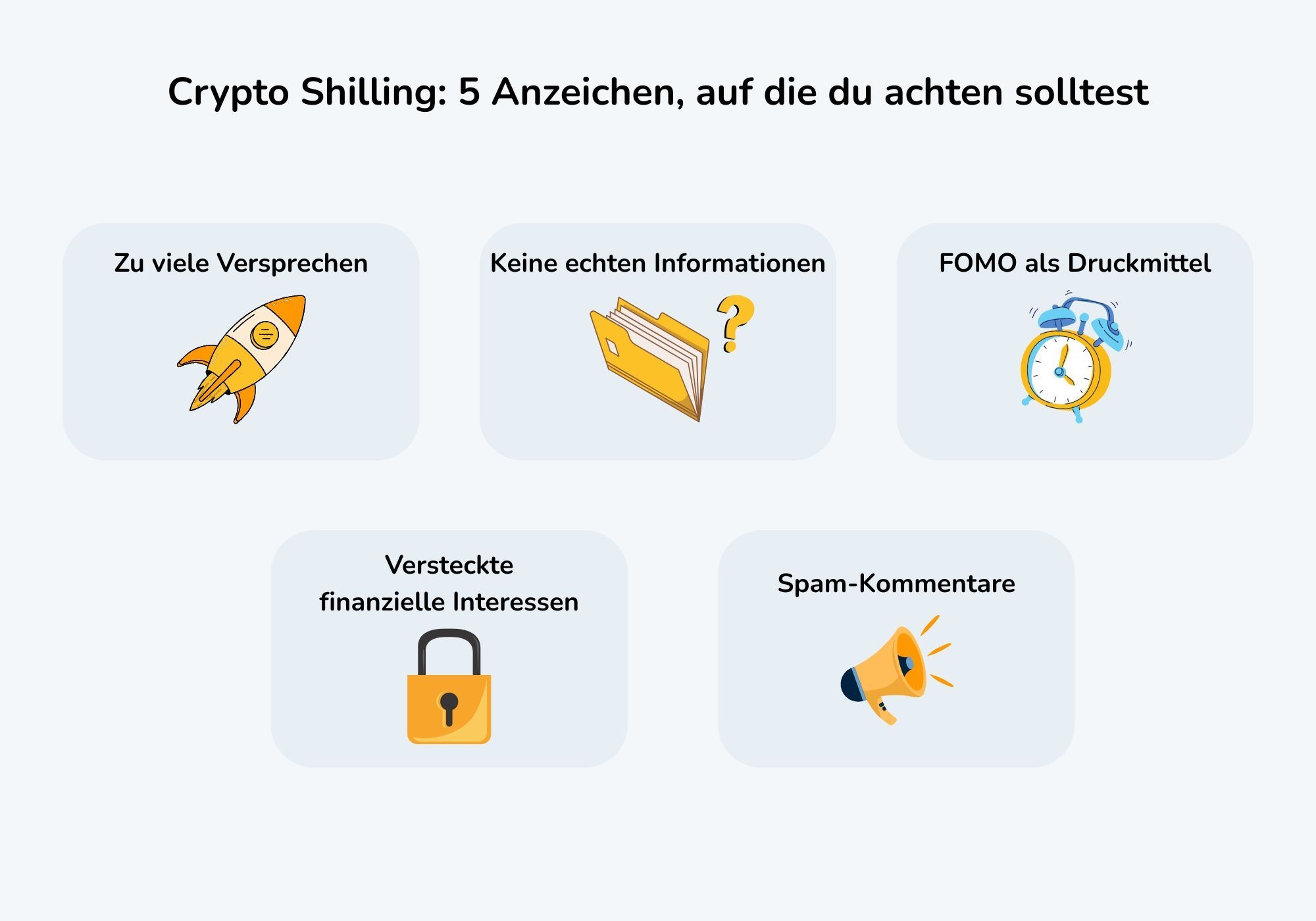 Shilling im Kryptobereich bedeutet die verdeckte Förderung von Projekten aus Eigeninteresse. Erfahren Sie, wie Sie typische Anzeichen erkennen und Ihre Investitionen mit Wissen, kritischem Denken und eigener Recherche schützen können.