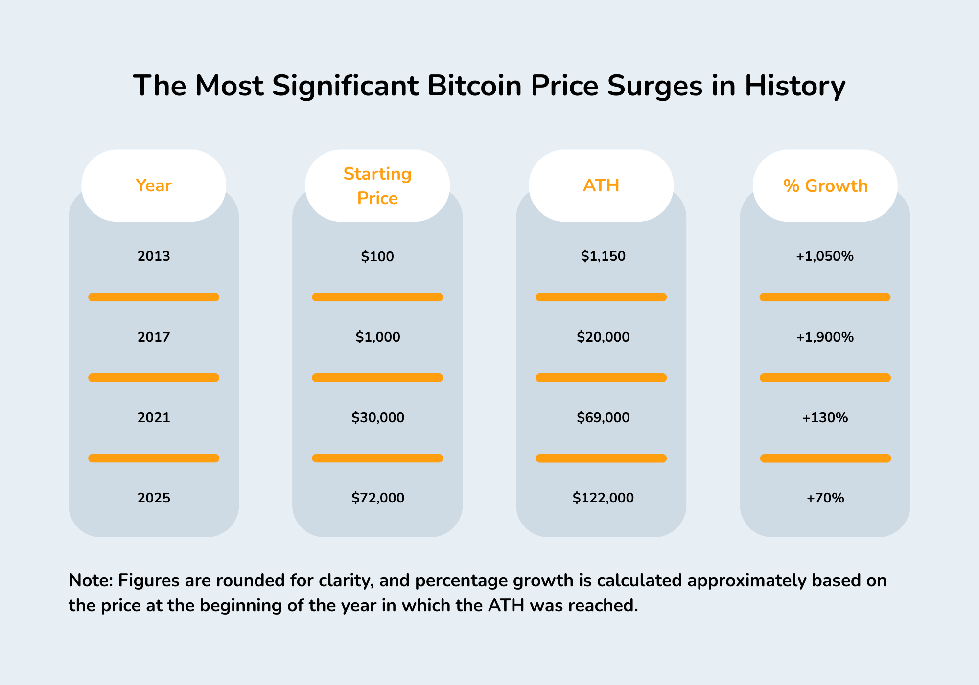 Throughout its history, Bitcoin has experienced numerous phases of growth and correction, but a few price surges stand out due to their scale and impact on the market.