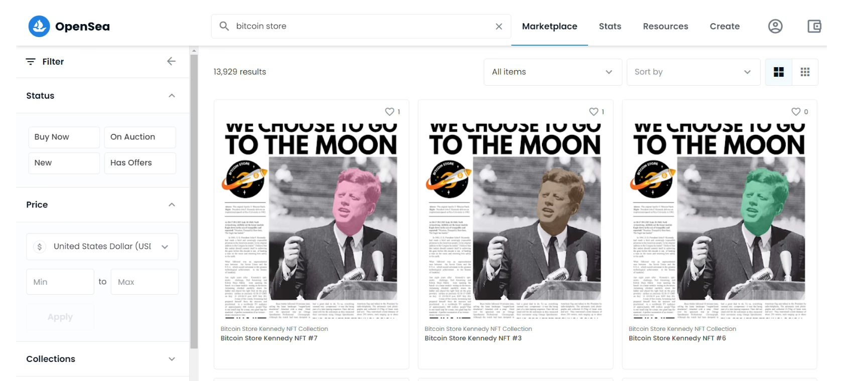 Vous pouvez consulter la collection officielle de NFTs de Bitcoin Store sur notre profil Opensea.