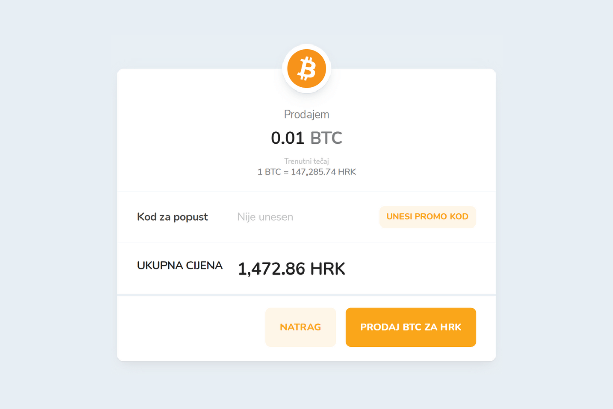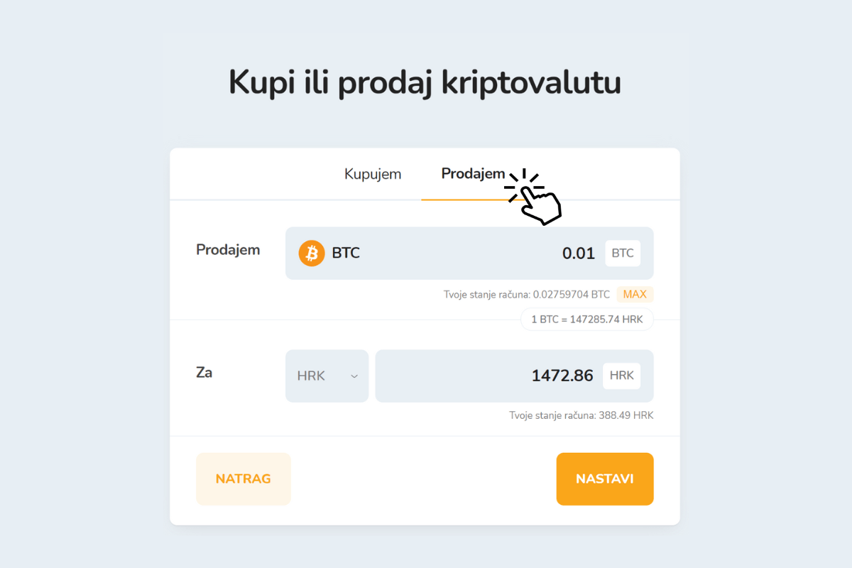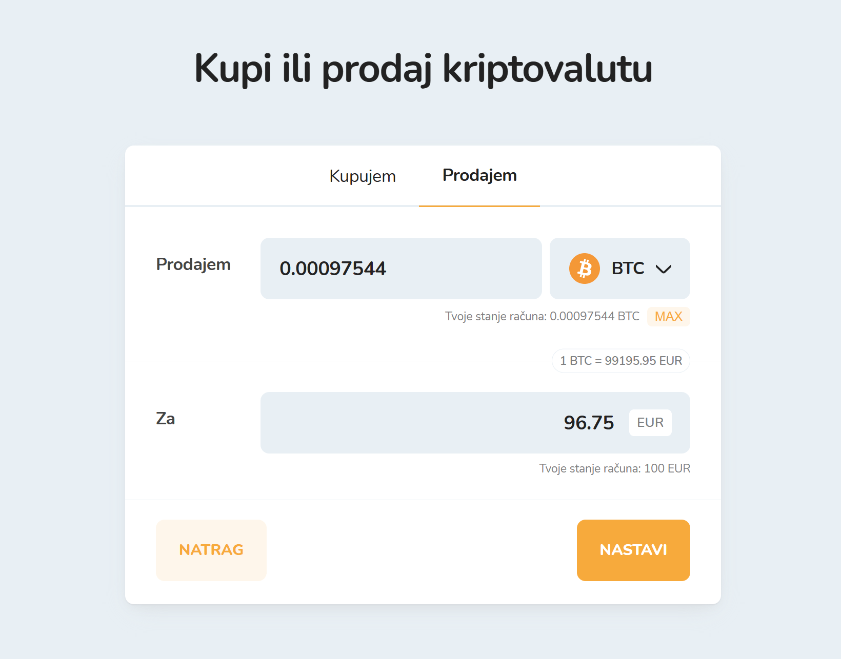 Unošenjem količine automatski će se izračunati vrijednost u EUR koju ćete dobiti (po aktualnom tečaju kriptovaluta).