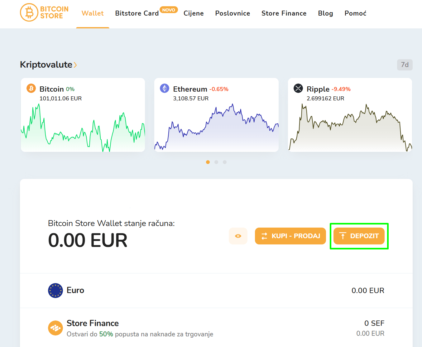 Uplaćujete ih tako što ćete kliknuti na opciju Depozit nakon prijave na svoj Bitcoin Store račun.