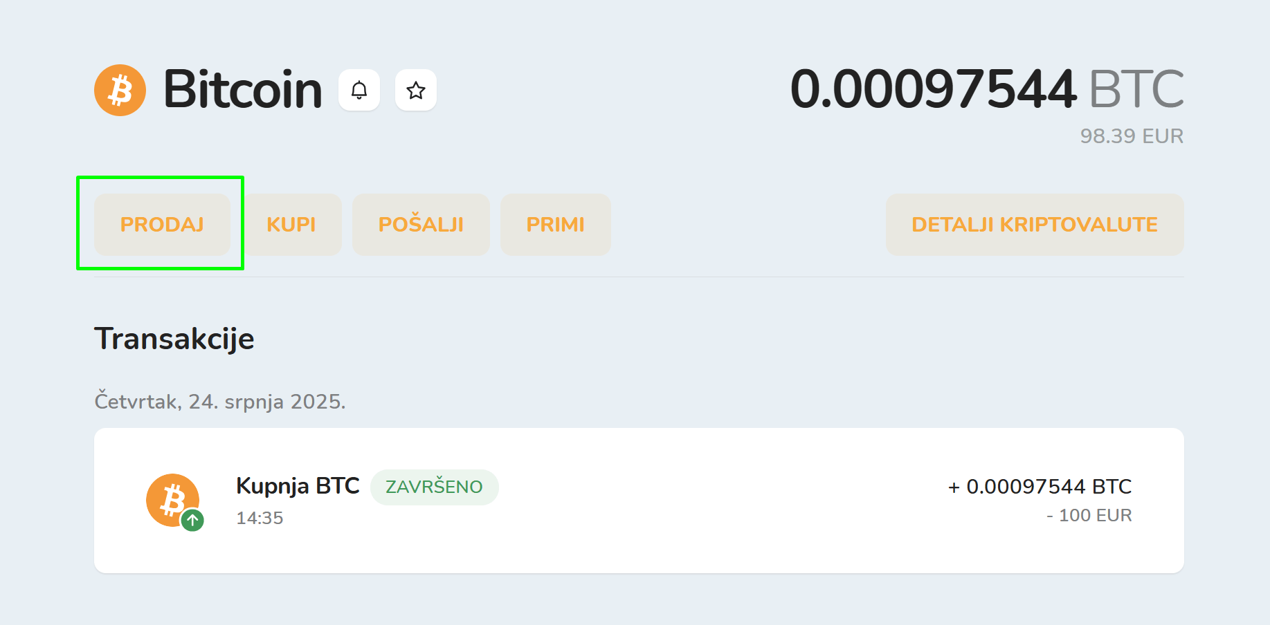 Potvrdite prodaju klikom na "Prodaj BTC za EUR".