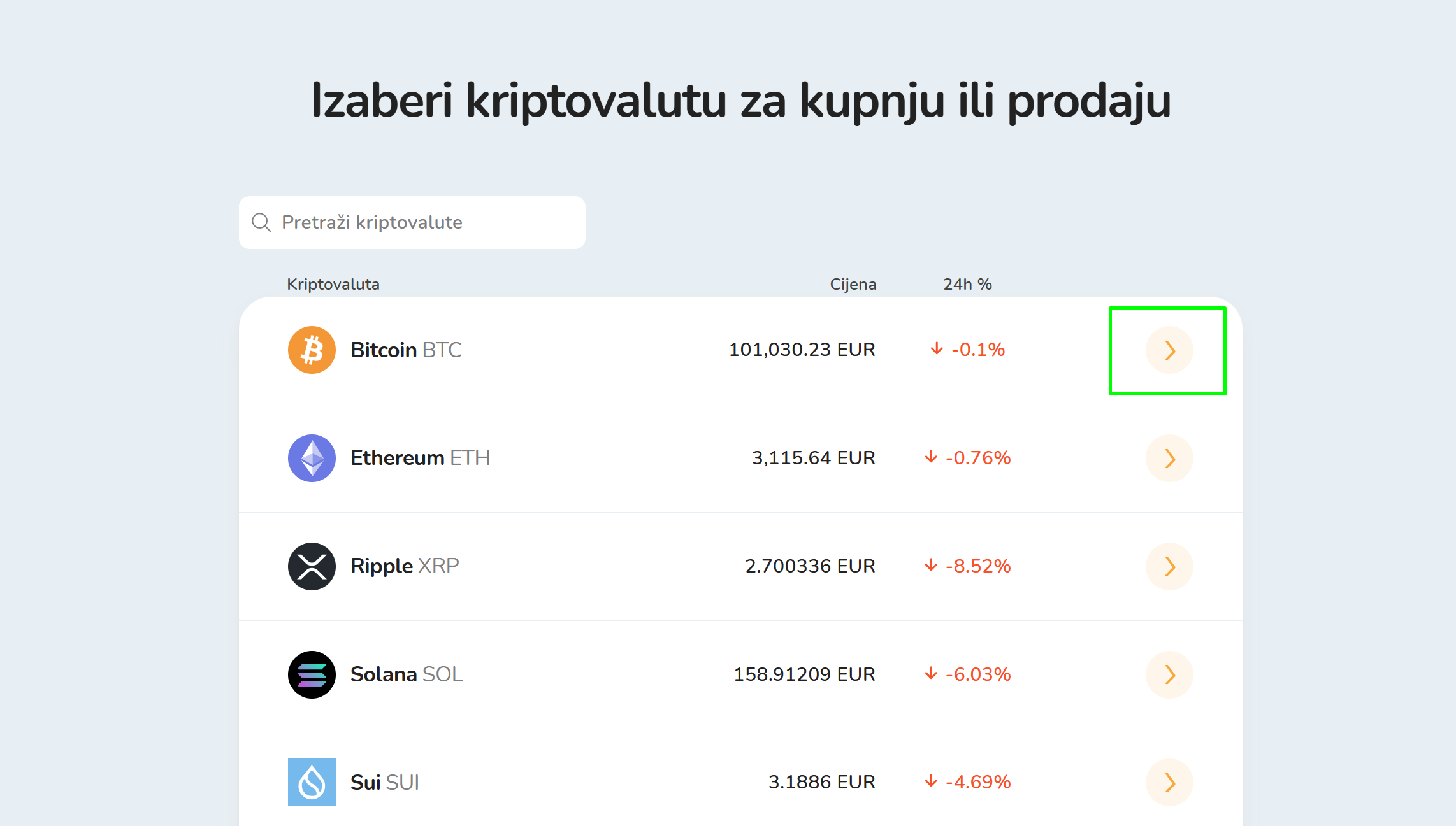 Odaberite kriptovalutu koju želite kupiti (za ovaj primjer koristit ćemo Bitcoin).