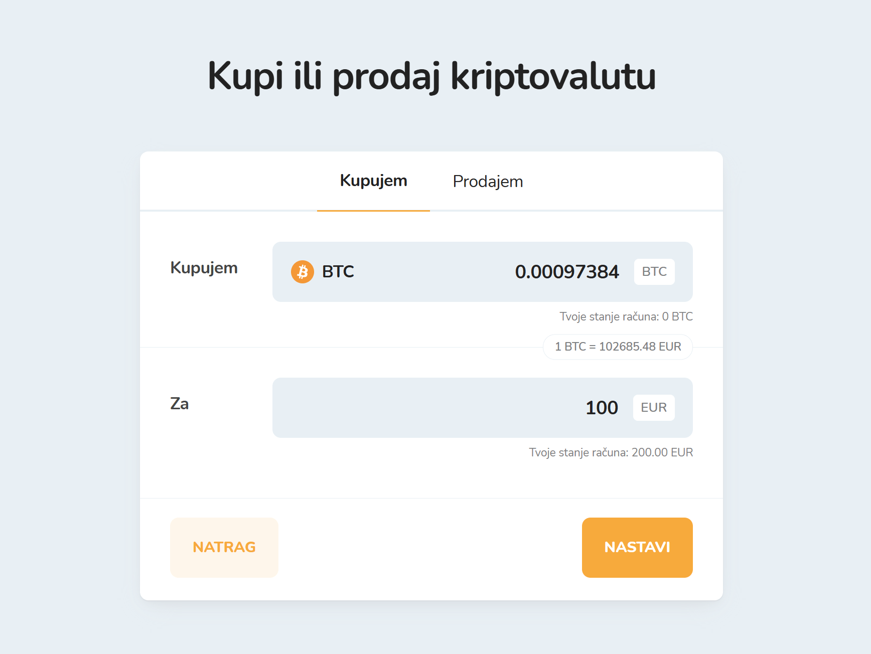 Unošenjem iznosa u EUR automatski se prikazuje iznos kriptovaluta koji biste trebali dobiti po aktualnom tečaju.