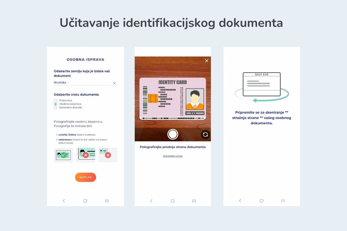 - Možete približiti svoju osobnu iskaznicu, putovnicu ili boravišnu dozvolu web kameri i fotografirati izravno ili učitati fotografije svog dokumenta.