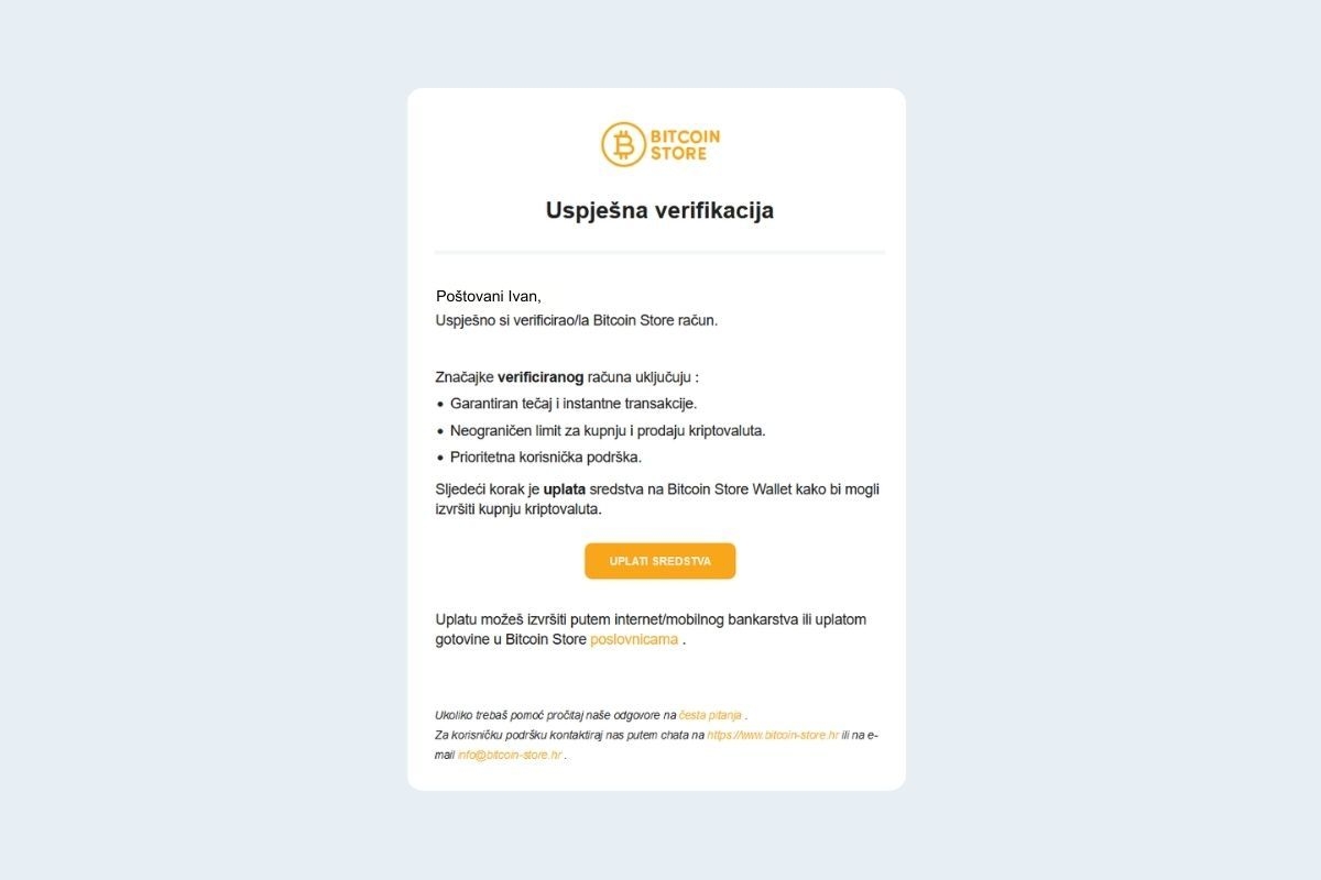Trebali biste primiti potvrdni mail naslovljen Uspješna verifikacija, što znači da je vaš račun sada potpuno verificiran i spreman za trgovanje!