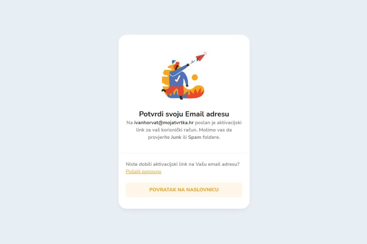 Nakon toga trebali biste primiti poruku u kojoj se traži da potvrdite svoju email adresu. Provjerite svoj poštanski sandučić i Spam ili Junk mape kako bi ste našli aktivacijski link koji vam je poslan.