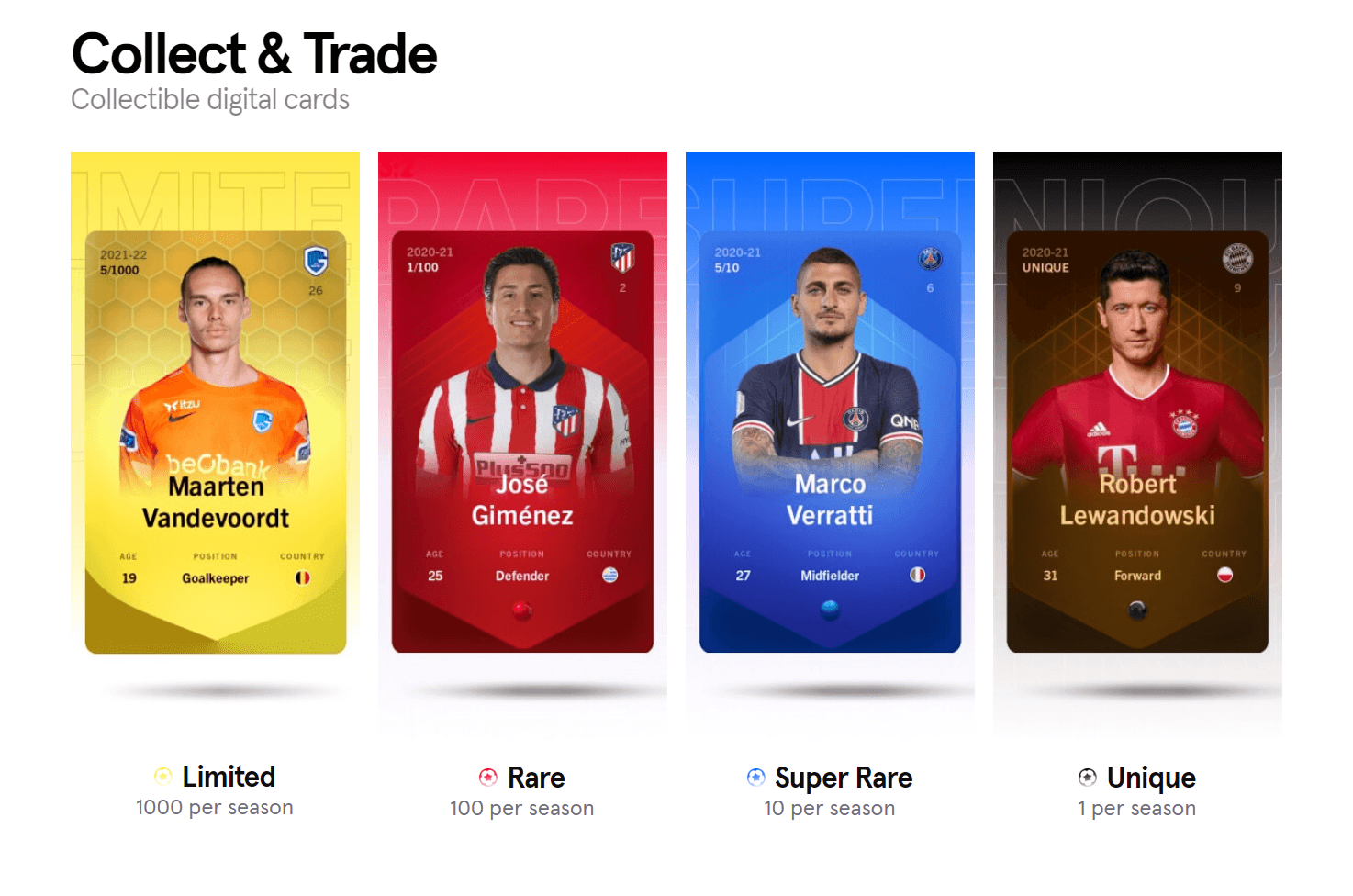 Karte nogometaša su raspoređene u 4 kategorije: obične, rijetke, super-rijetke i jedinstvene.