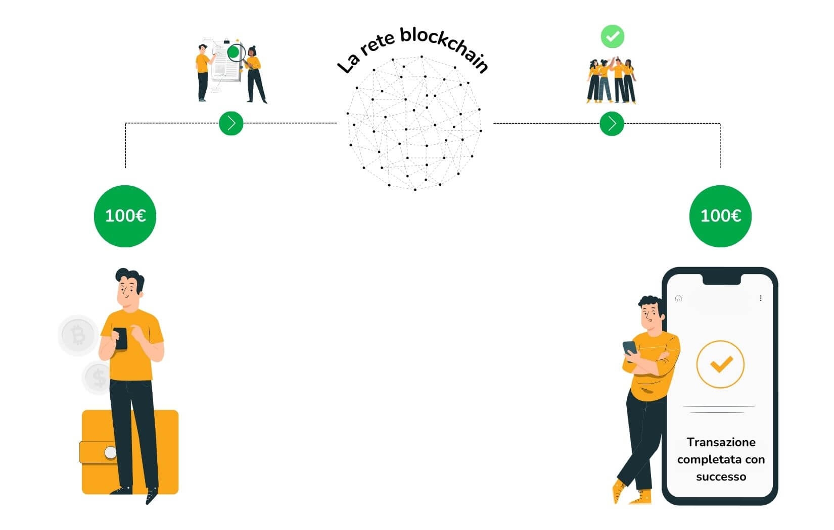 Diciamo che la Persona A invia 100€ alla Persona B tramite una rete blockchain.