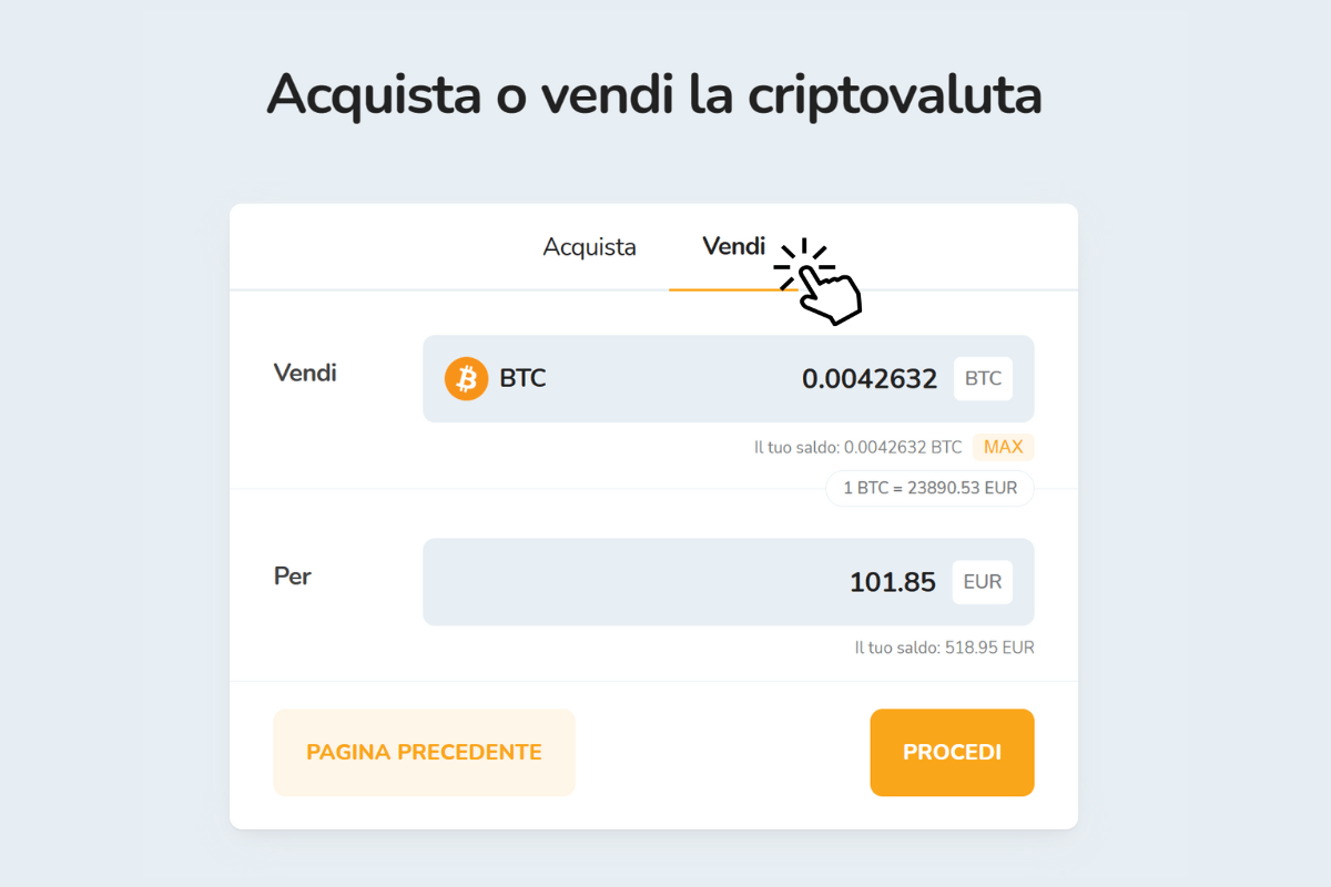 Inserisci la quantità di criptovalute che desideri vendere. Inserendo la quantità, verrà calcolato automaticamente il valore in EUR che riceverai (al tasso di cambio attuale delle criptovalute).