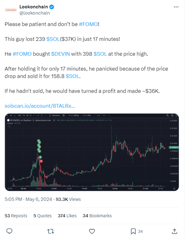 În mod natural, prețul a început să scadă, el a intrat în panică și a vândut totul, pierzând 239 SOL.